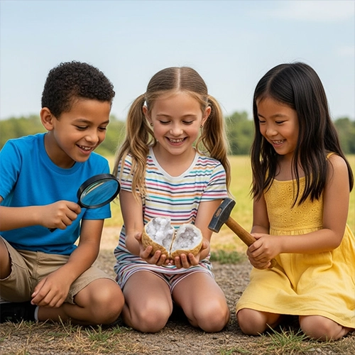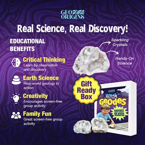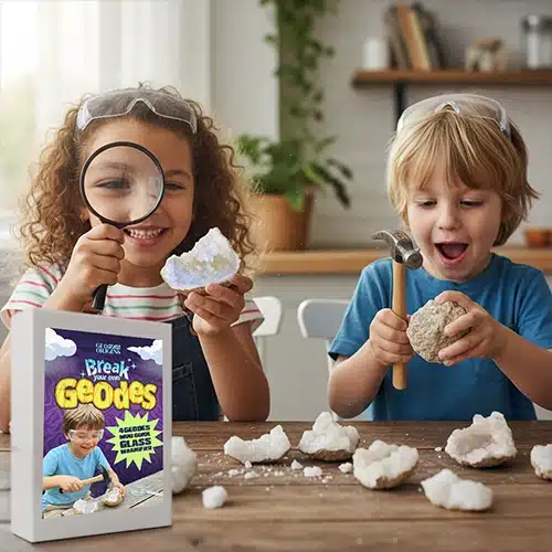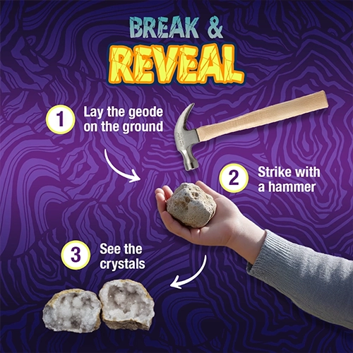 Uncover the hidden beauty inside natural geodes with this mini kit. Includes 4 hand-selected geode halves, a magnifier glass, an educational guide, and a bag. Perfect for hands-on learning, science exploration, or a unique gift.